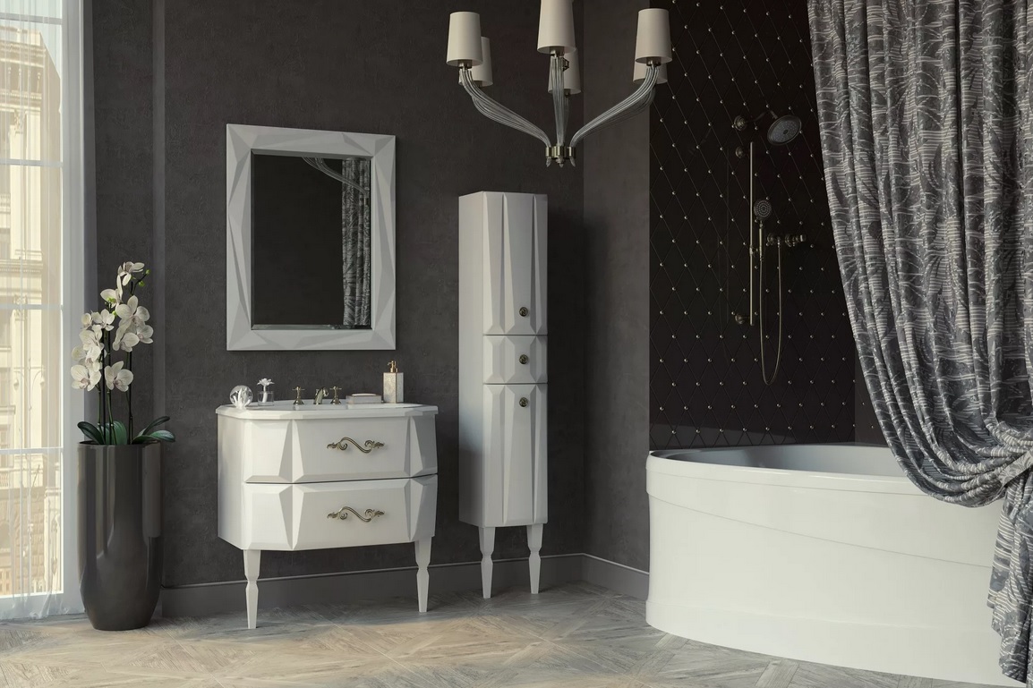 Авторский дизайн мебели подчеркивает ее практичность и функциональность. Фасады из МДФ, облицованы ПВХ-пленкой премиум-класса. Максимально защищает от влаги технология Аquastop. Объемные поверхности получают по суперсовременной технологии 3D-формования. Раковины производят из революционного материала полутитана (Polytitan). Красивые зеркала в раме из