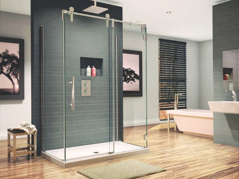 Обратите внимание! Дверь распашного открывания обязывает рассчитать траекторию хода двери и обеспечить пространство для свободного прохода. Зато, вне всякого сомнения, такая система – это красиво, удобно и очень практично. Силиконовый уплотнитель устраняет зазоры, не позволяя воде просачиваться за пределы кабины. Механизм петель сконструирован так, чтобы исключить проседание двери в процессе эксплуатации. Душевое ограждение монтируется на специально подготовленный пол или поддон. Поддон – акриловый, на металлическом каркасе; передние и пристенные бортики поддона – дополнительный барьер для предотвращения попадания воды на пол.