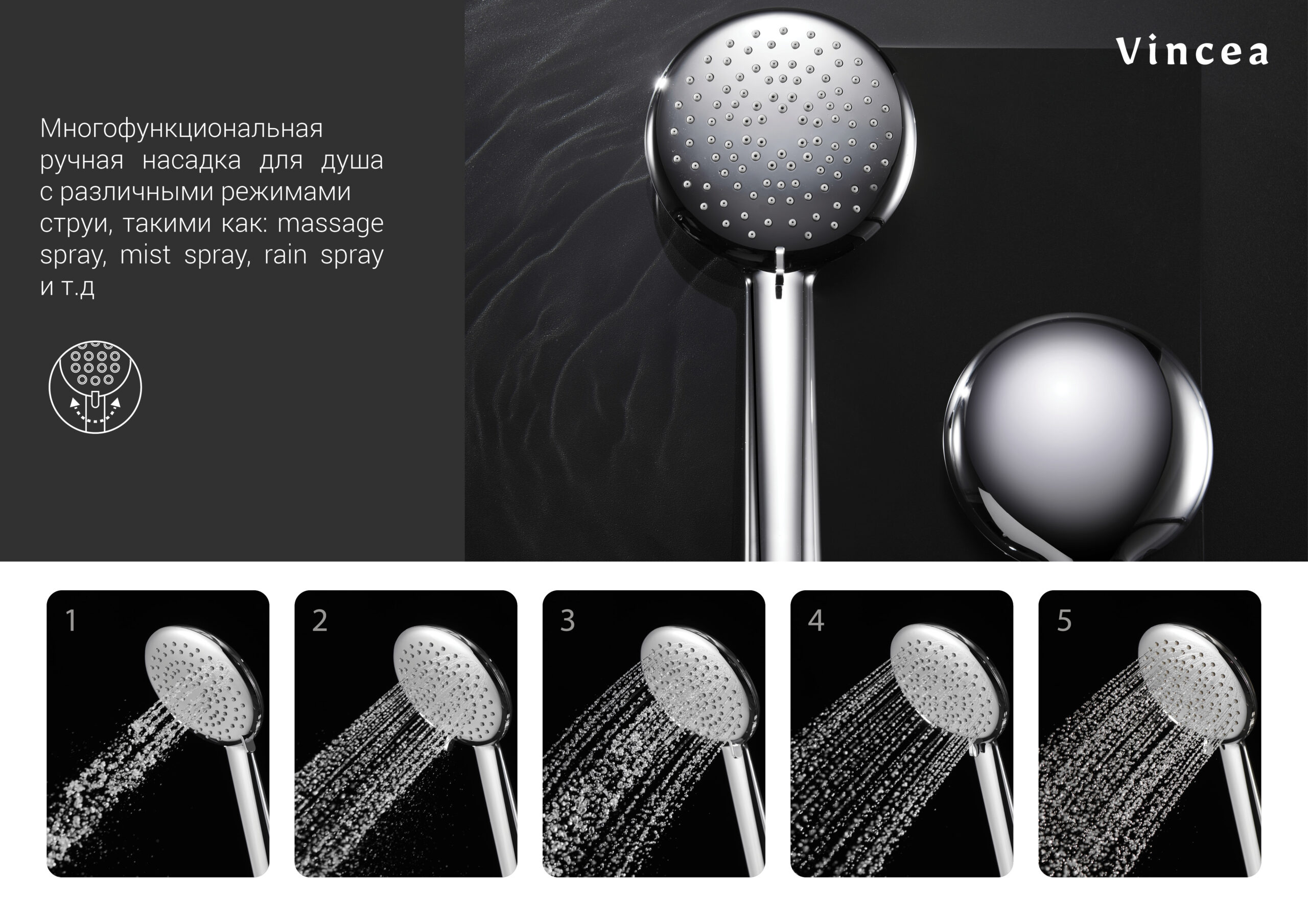 Душевая лейка - элемент для рассеивания потока воды на струи. Несколько режимов, массажные функции.