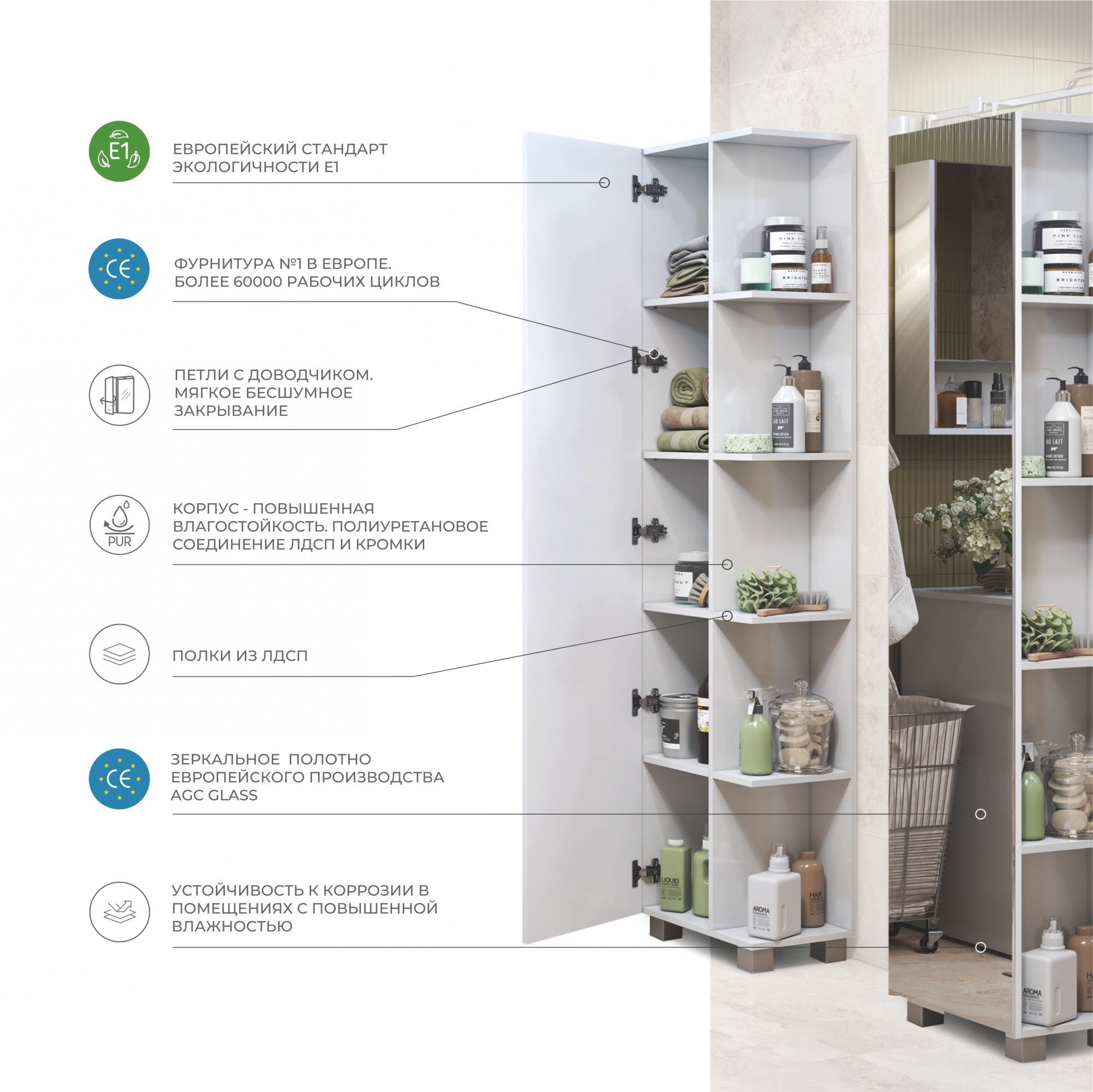 Влагостойкая ЛДСП - это лист ДСП, облицованный при сверхвысоких температурах меламиновой пленкой в один или несколько слоев. ЛДСП бывает покрыта специальным лаком, который придает ей больший блеск и долговечность. Влагостойкая ЛДСП - это современный высокотехнологичный материал широкой используемый в производстве мебели для ванной. Этот материал совершенно не подвержен реакции на перепады температур и высокую влажность. Кроме того, влагостойкая ЛДСП имеет идеально ровную поверхность, что позволяет изделиям из нее сохранять первоначальный внешний вид очень долгое время.