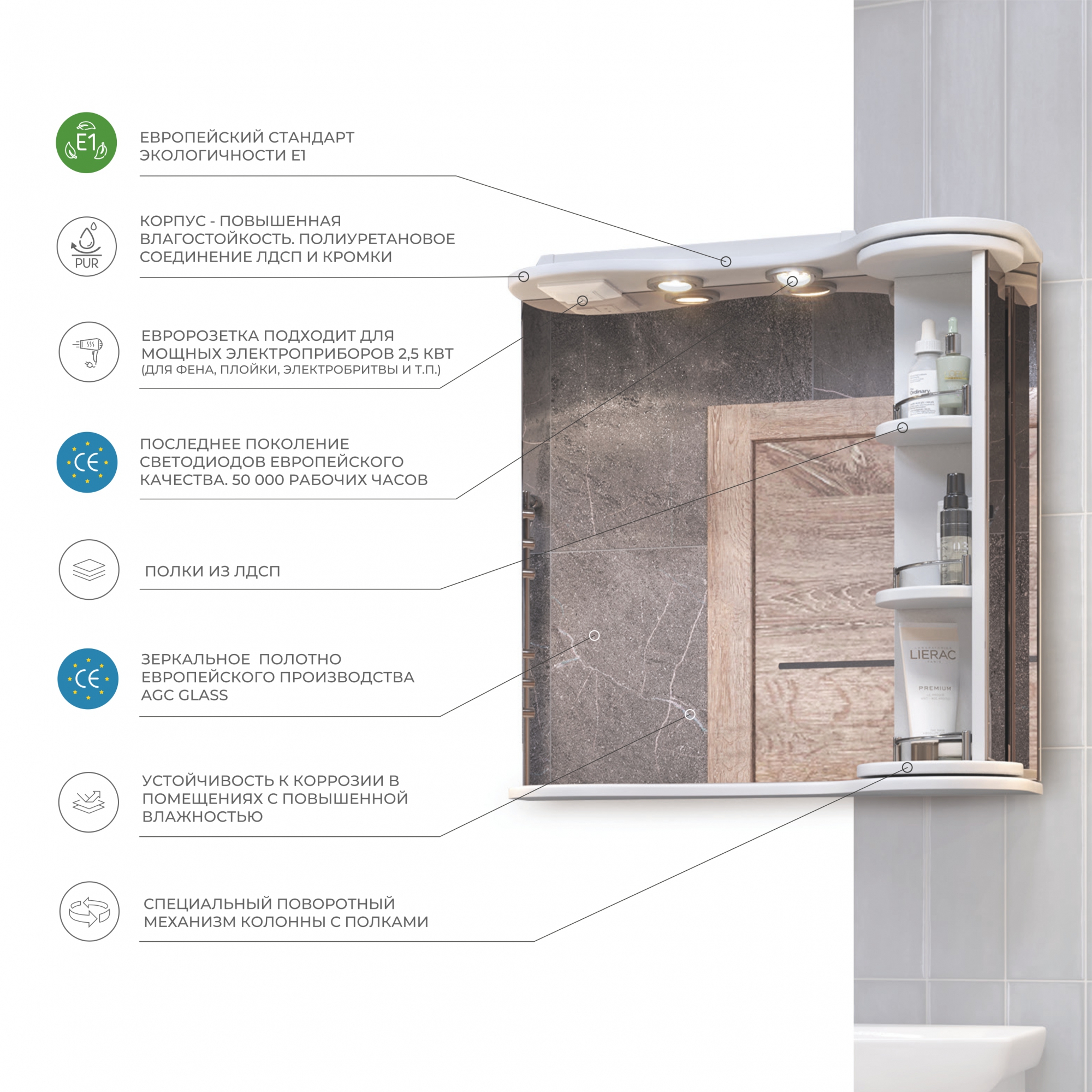 Зеркало зрительно увеличивает пространство, а подсветка добавляет ощущение уюта и камерности. Пригодится во время бритья, укладки волос и косметических процедур.